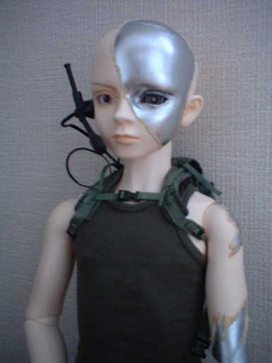 アイはクリスマスイルミネーションのLEDを、コードを短く切って使用、バックパックのなかに電池パックとスイッチがあります。盛り削りに関しては「評価されなかったらすべて元に戻る」ように作ったので、下地処理もコーティングもしておらず、テンションゴムも切っていません。