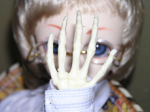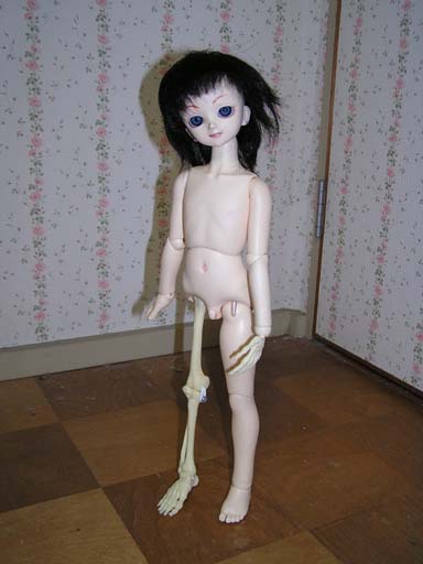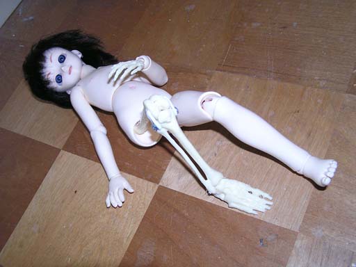 写真がこれだけしかないのでわかりづらいが、大腿骨には縦にドリルで穴を通し、通常のSDの大腿部パーツのようになっている。下腿骨は穴が開けられないので、見たとおり、関節に横向きに穴をあけ、下腿骨にはボルトを通して固定してある。関節の凸凹面はもちろん人体標本なので、膝は正しくはまって滑らかに動く。自立も十分可能だった。グッズとはいえ、骨格標本をテンションゴムで繋ぐと自立する・・・人体のすばらしさを改めて感じた。