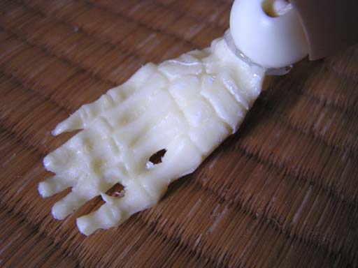 手首は細すぎて加工が難しかったため、残念ながら関節パーツにホットボンドで固定。通常のMSDジョイントとなっている。最初はおそるおそるのカスタム開始だったので、足首も同じようにホットボンド固定していたのだが、飽き足らず(苦笑)・・・・こうなった↓